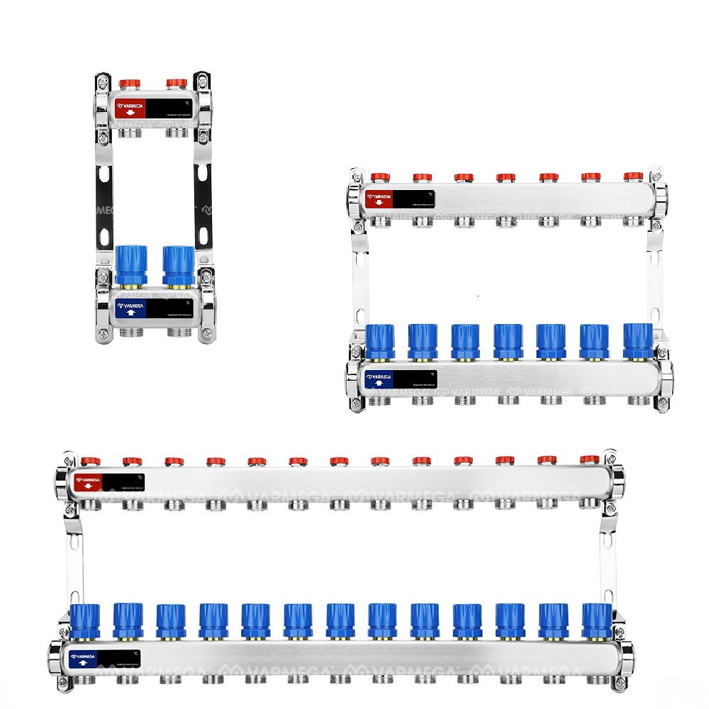 Коллекторные группы предварительной сборки из нержавеющей стали с балансировочными и термостатическими вентилями марки Varmega предназначены для распределения и регулирования потоков теплоносителя в низко- и высокотемпературных системах отопления. Оснащены балансировочными вентилями на подающем коллекторе и термостатическими вентилями с размером M30x1,5 (с возможностью установки термоэлектрических приводов) на обратном коллекторе.