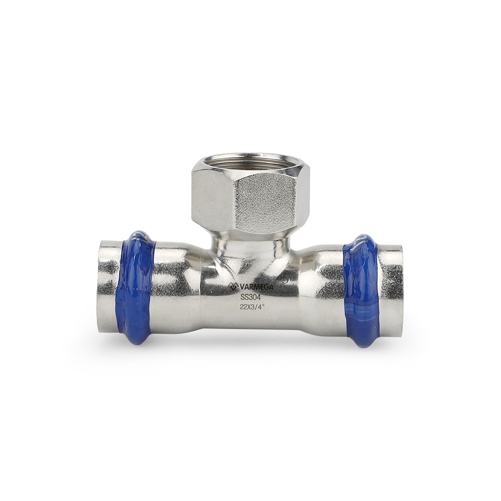 Тройник с внутренней резьбой Varmega Inox Press с двух сторон имеет раструбное соединение для труб, а с третьей стороны фитинга находится внутреннее резьбовое соединение. Данный фитинг позволяет присоединить к трубопроводу различные резьбовые элементы (краны, фильтры и т. п.), также дает возможность подключиться к другому типу трубопровода.